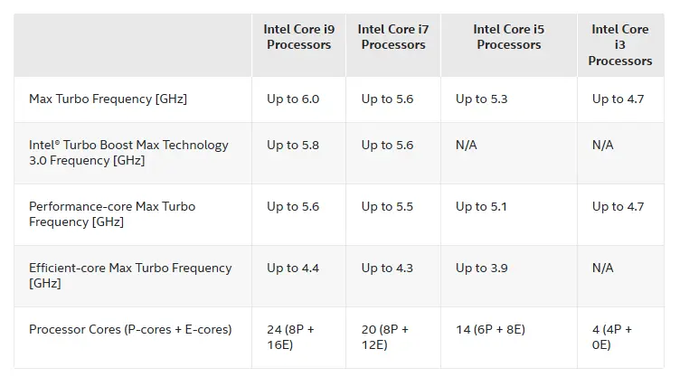 בתמונה – תדרים ומספרי ליבות של מעבדי הדסקטופ של אינטל מסדרת דור 14. ניתן לראות בירידה בתדר ככל שנרד במספר תת הקטגוריה. מקור – אינטל.