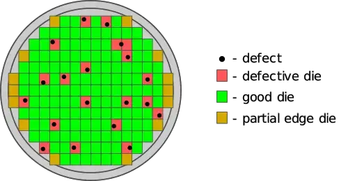 בתמונה – אילוסטרציה של וייפר ועל גביו דפקטים והdies שהושפעו מהם. אחוז הdies הירוקים מתוך כלל הdies שיוצרו בוייפר נקרא Yield. אם למישהו זה נראה מוכר, זה לא במקרה, זה בדיוק הלוגו של TSMC. מקור – WikiChip.