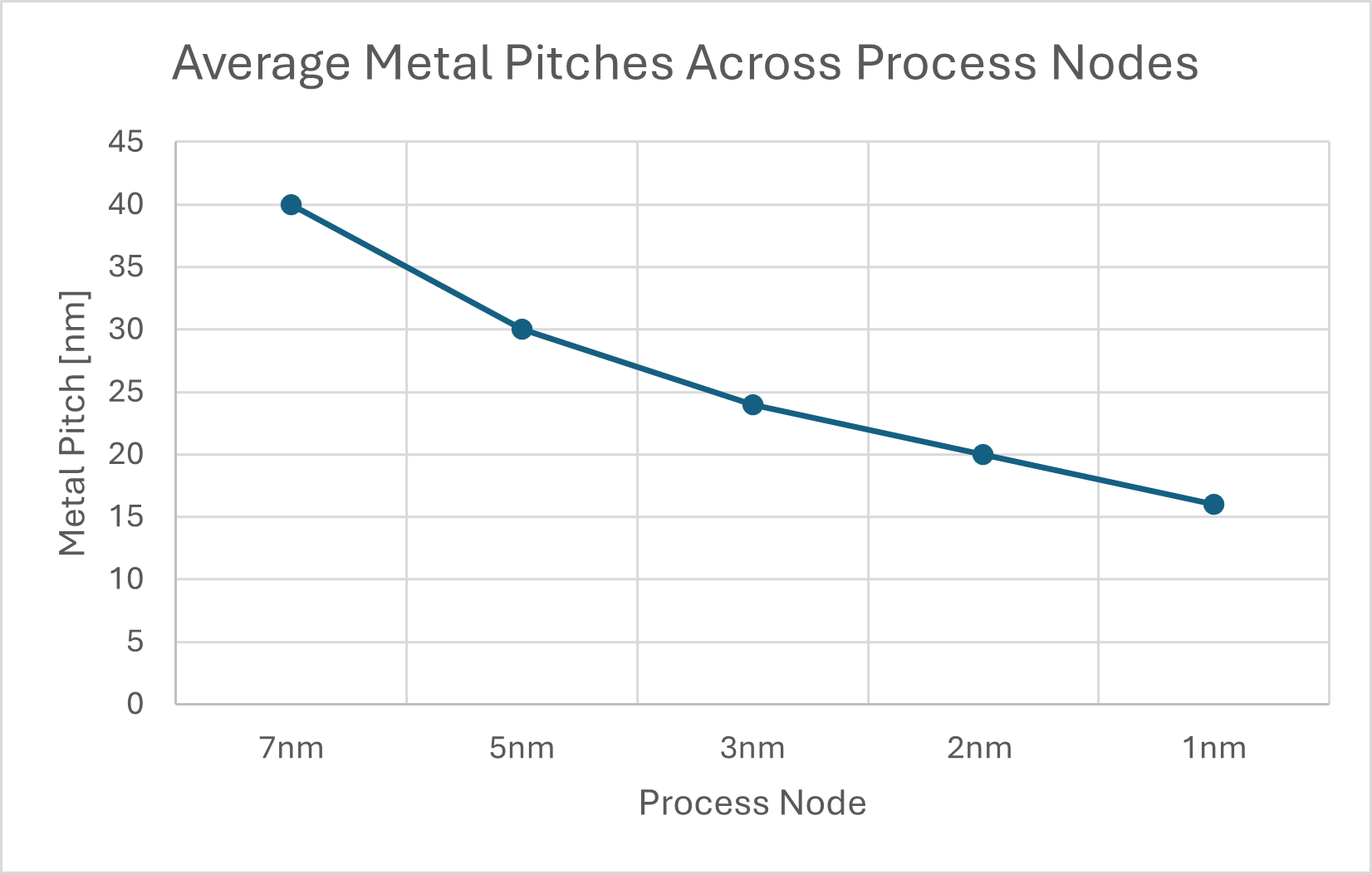 אז היינו מצפים שבין דור לדור המרחק בין כל צמד חוטים (נקרא גם pitch) העובר בשכבה מסוימת יקטן וכן עובי כל חוט כזה יתעבה. אולם, גם כאן הטכנולוגיה נתקלת בקיר וקצב הקטנת הpitch בכל השכבות איטי ממה שהיינו רוצים.