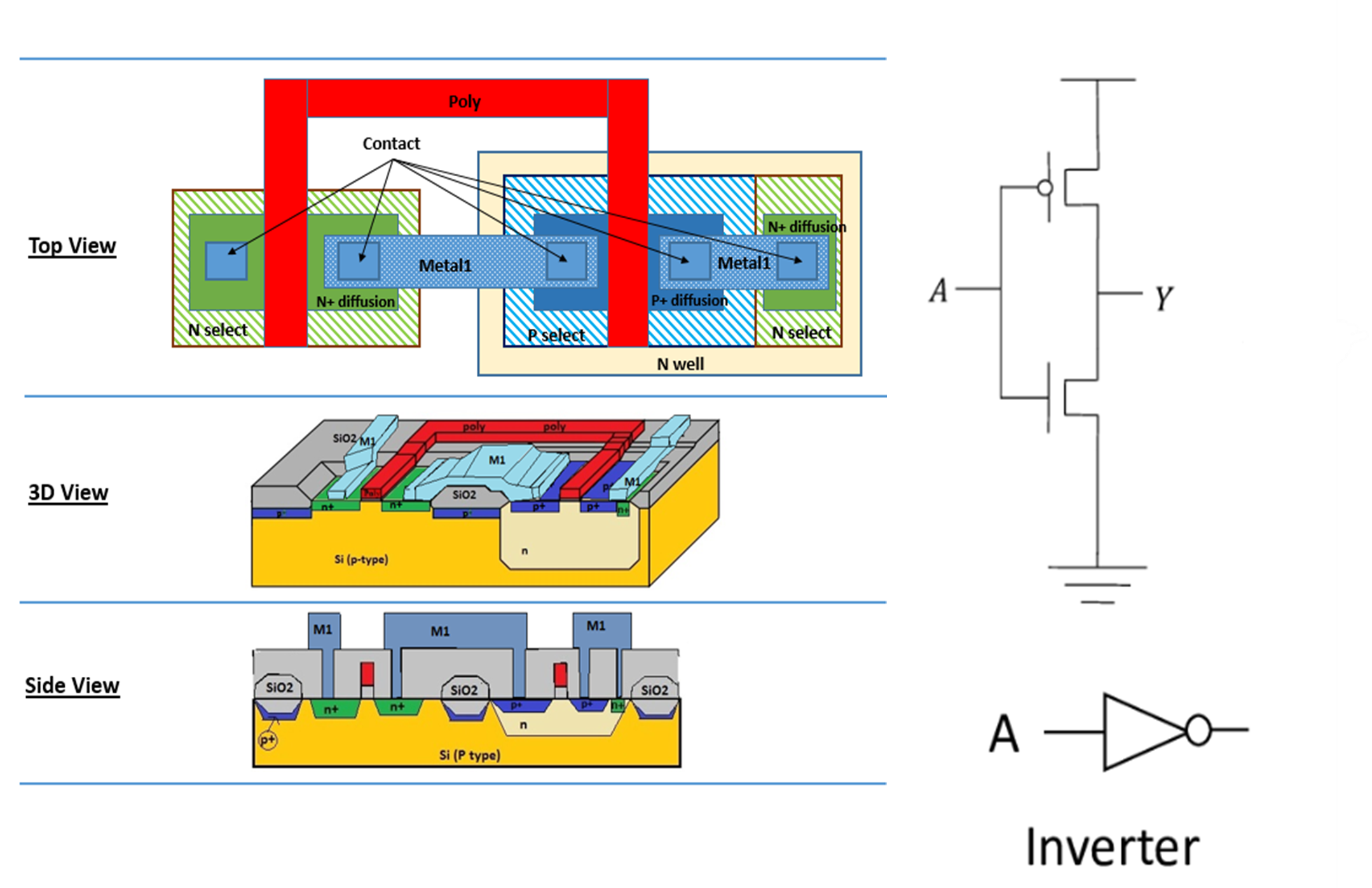לדוגמה, תא המממש את הפונקציה הלוגית הפשוטה ביותר, NOT (נקרא גם אינוורטר – מהפך), יהיה מורכב מ2 טרנזיסטורים המחוברים יחדיו בקונפיגורציה מסוימת כך שכל סיגנל חשמלי הנכנס אליו דרך פין הכניסה, ופוגש את ה-gate של הטרנזיסטורים, יצא מהופך מפין המוצא של התא. באופן סכמטי זה נראה כמו בתמונה מטה. בסיליקון, חלקי הטרנזיסטורים למשל יהיו בשכבות מסוימות והחיבוריות ביניהן תמצא בשכבה נפרדת. הקשר של התא אל העולם החיצון יהיה באמצעות פיני הכניסה והיציאה שלו, החשופים בשכבה אחד מעל להכל – השכבה הנמוכה ביותר מבין שכבות הFrontend. כך גם פיני אספקת המתח והאדמה.