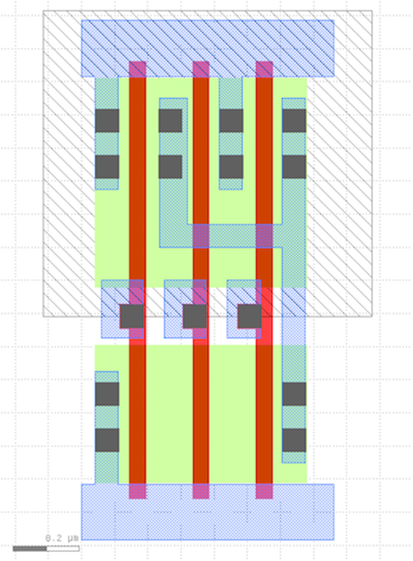 בתמונה – שרטוט של מבנה פיזיקלי של תא לוגי מסוג NAND3. כל צבע מתאר שכבה אחרת מהבסיס ועד שכבת המתכת הנקראת M1 של פיני הסיגנל/מתח של התא.