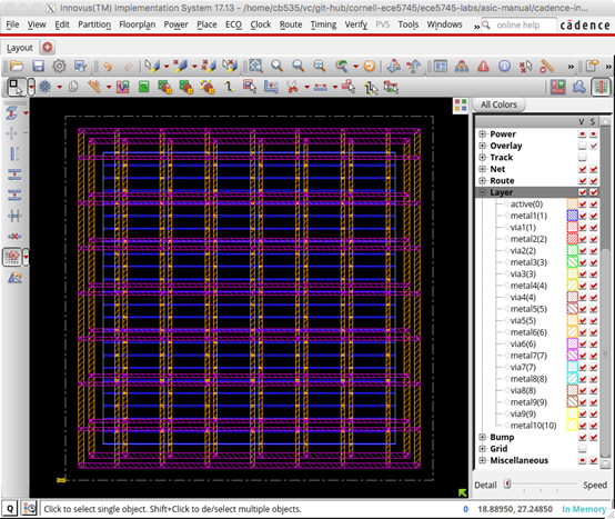 בתמונה – רשת הובלת הספק (נקראת Power Grid או PDN – Power Delivery Network). כל צבע מתאר שכבת מתכת אחרת